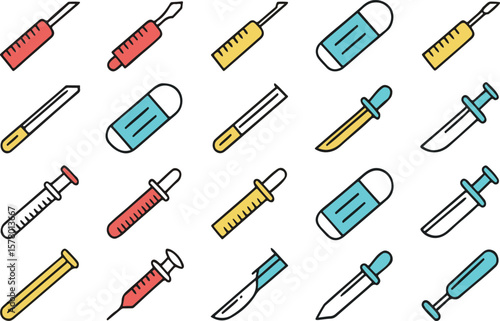 Colorful medical and surgical tool icons in a flat linear design on white background