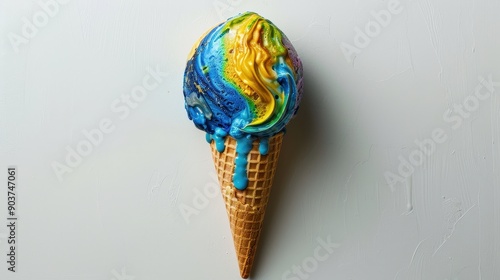 Colorful Melting earth icecream cone with the World map pattern on white background,Global warming and climate change concept,world travel,Saving environment,save clean planet,rainbow icecream.