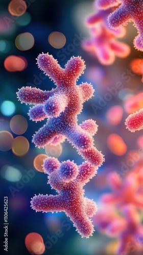 Colorful microscopic structures appear to interact gracefully against a vibrant background, showcasing intricate details of cellular features and scientific advances in microscopy