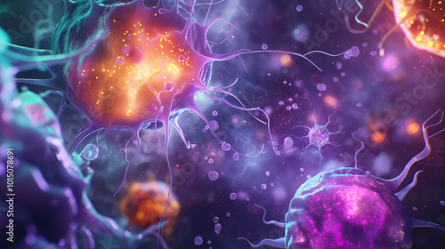Colorful microscopic view of neurons and cells interacting in a vibrant biological environment during cellular activity