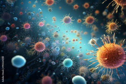 Colorful microscopic view of viruses and bacteria in a dark, illuminated environment showcasing their diverse structures and forms