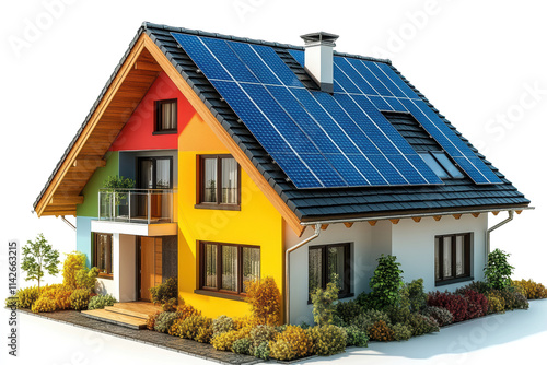 Colorful modern house with solar panels on the roof, surrounded by lush greenery and colorful bushes, showcasing sustainable living.