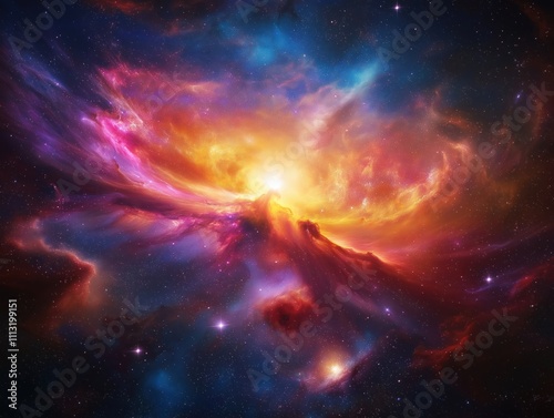 Colorful nebula displays vibrant cosmic colors. Vast space filled with star clusters. Abstract design galactic elements. Stunning visuals portray beauty, mystery of outer space. Intricate details