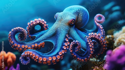 Colorful Octopus Swimming Among Coral Reefs in Vibrant Underwater Scene with Rich Marine Life Details