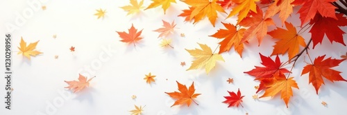 Colorful orange maple leaves scattered on a white background, fall color, tree, snowy scene
