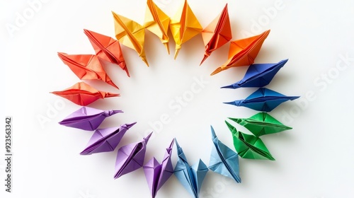 Colorful origami cranes arranged in a circular pattern on a white background, creating a vibrant and artistic display.