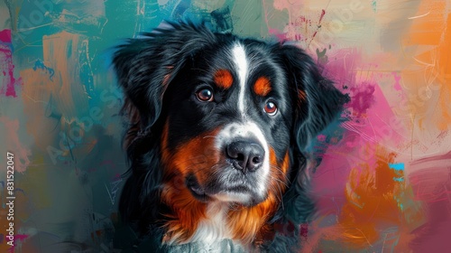 Colorful painting of a Bernese Mountain Dog against a vibrant abstract background, capturing the regal essence of the breed.