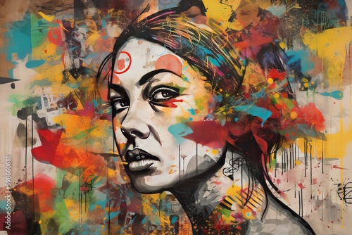 Colorful painting of a woman's face. urban art painting of a woman with many colorful paints on her face, in the style of textured illustrations, stencil graffiti. Generative AI
