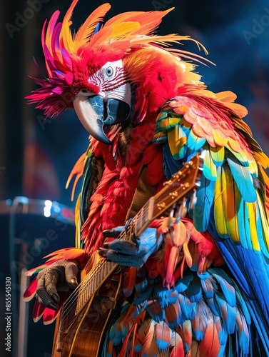 Colorful Parrot Musician Performing Live Music with Instruments in a Crowd-Pleasing Show