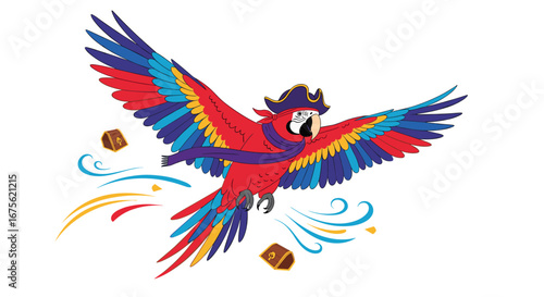 Colorful parrot pirate soaring with open wings, ready for adventure with treasure chests