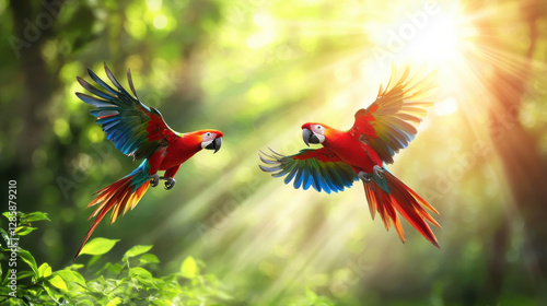 Colorful parrots in flight displaying brilliant feathers in sunlight