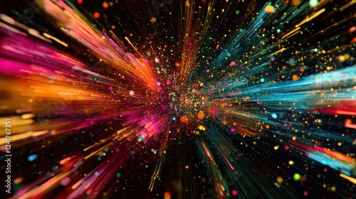 Colorful particles exploding from the center against a black background create a dynamic motion blur effect, conveying speed, energy, and innovation for futuristic projects