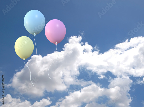 colorful pastel air balloon flying in a blue sky background, 3D rendering image