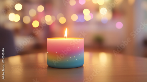 Colorful, pastel-hued rainbow-like candle with a flame on a table in a room, with a soft-focus photographic style and a bokeh background.
