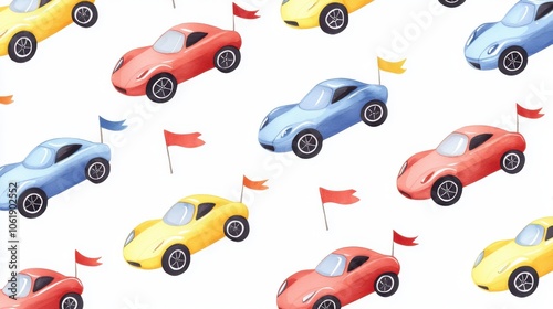 Colorful pattern featuring various racing cars with flags on a white background, perfect for children's designs and decor.