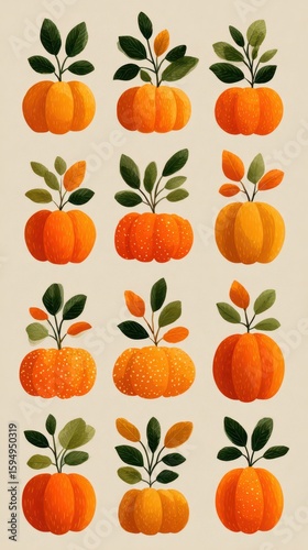 Colorful pattern of pumpkins and leaves arranged in a stylish design for autumn harvest theme