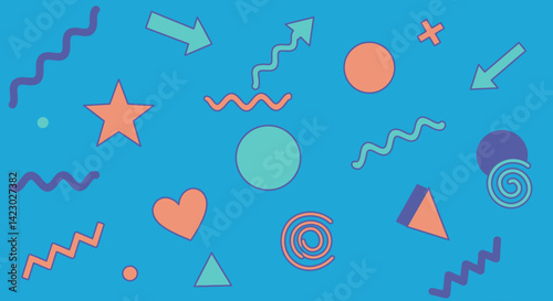 Colorful pattern of shapes and arrows on a blue background Memphis Style