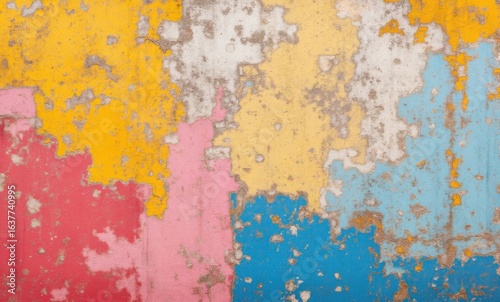Colorful peeling paint revealing layers of vibrant hues in shades of blue, yellow, pink, and red.
