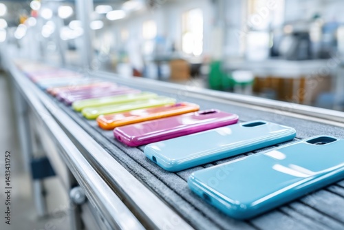 Colorful phone cases on the assembly line in a bright factory setting