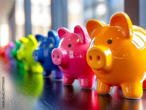 Colorful piggy banks lined up on a table, symbolizing savings, finance, and budgeting in a playful and vibrant setting.