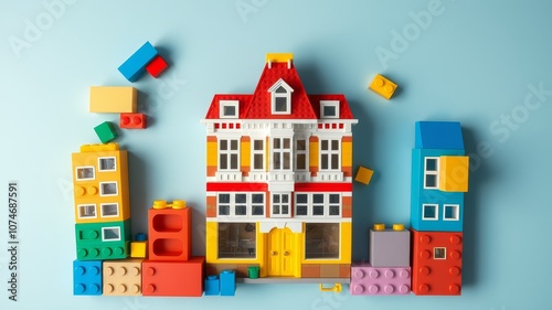Colorful Plastic Building Blocks on Pastel Blue Background - Educational Baby Game Concept