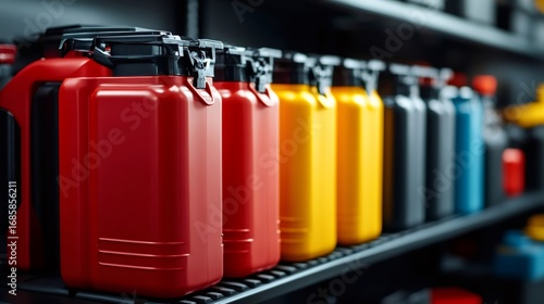 Colorful plastic jerrycans standing on shelf in hardware store