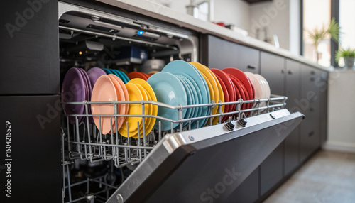 Colorful plates arranged inside a modern dishwasher in kitchen