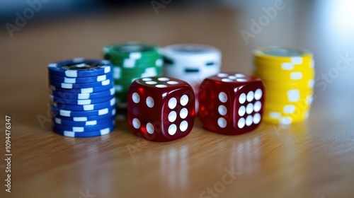 Colorful Poker Chips and Dice Arranged on a Wooden Surface Ideal for Gambling, Casino Games, and Board Game Imagery for Stock Photo Use