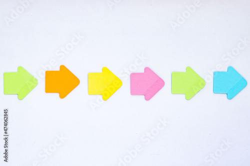 colorful post it arrows in the form of workflow or process, template with white background, six steps