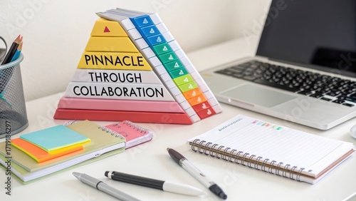 Colorful Pyramid of Books on Desk Symbolizing Teamwork and Growth