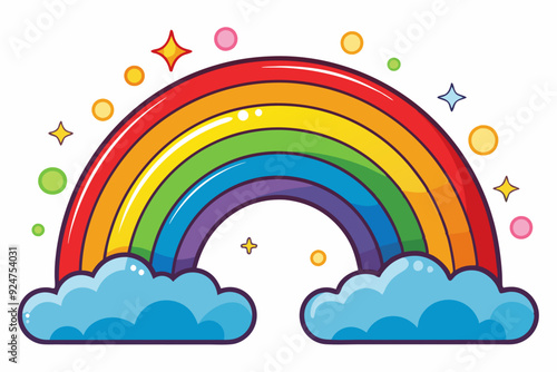 Colorful Rainbow Arcing Over Two Fluffy Clouds With Stars and Circles