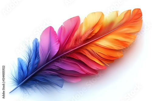 Colorful rainbow feather with gradient from blue to orange on white background, isolated design element for creative projects and decorative artwork.