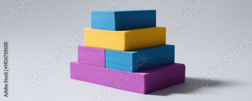 Colorful rectangular blocks are stacked in a pyramid shape. Concept: playful geometry, construction, minimalism