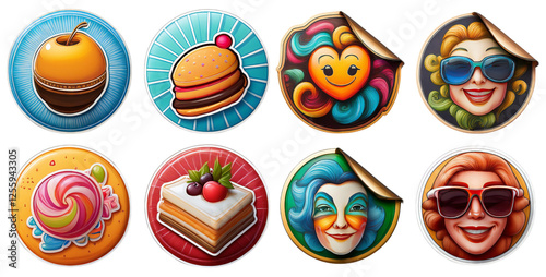 Colorful Retro Icons for Desserts and Happy Faces, isolated on transparent background