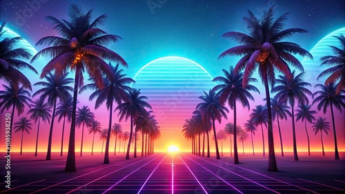 Colorful retro neon landscape background with palm trees, perfect for digital art
