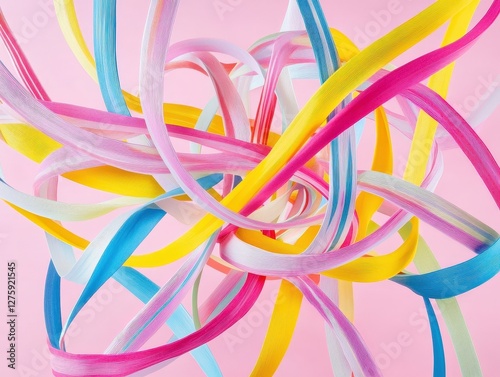 Colorful ribbons intertwine on pastel, create festive and cheerful background, great for party invitations