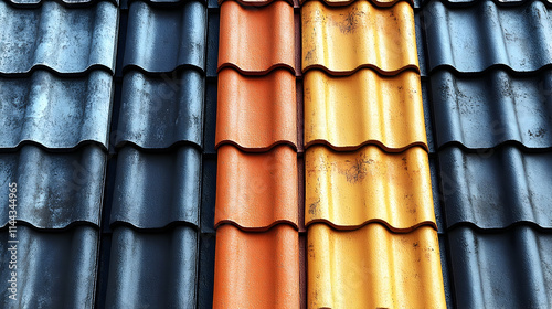 Colorful roof tiles arranged in rows, showing various colors and textures.