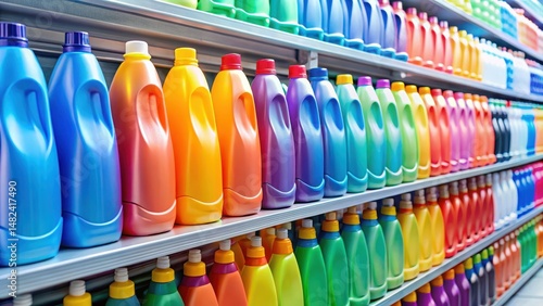 Colorful rows of various laundry detergent bottles on supermarket shelves stacked neatly, household items, colorful bottles
