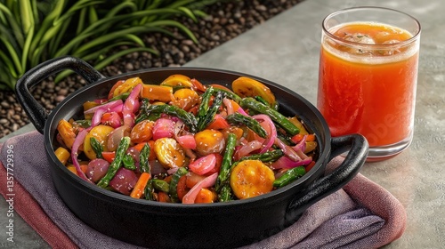 Colorful saut?ed vegetables in pan, with juice, outdoor setting