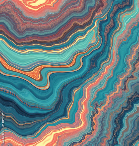 Colorful seamless pattern features iridescent liquid marble wavy texture. Abstract foil background with wave lines, holographic metallic effect. Interior decor wallpaper with three-dimensional