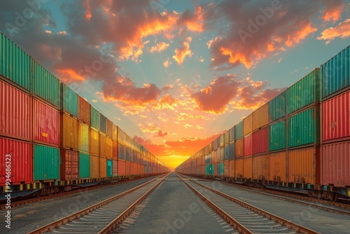 Colorful shipping containers line the railway tracks at sunset, creating a vibrant horizon