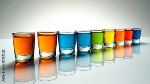 Colorful shot glasses filled with vibrant drinks arranged in a row