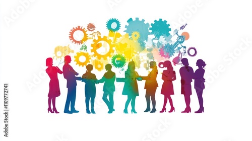 Colorful silhouettes of people networking with gears.