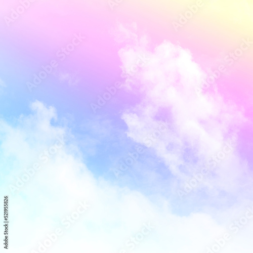 Colorful sky with soft white clouds and the crossing of rainbows. pastel colored magical fantasy background. Sweet Dreams concept for Wallpaper, Backdrops and Design.