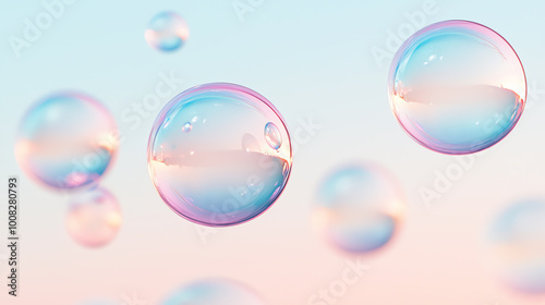 Colorful soap bubbles floating against a soft pastel background.