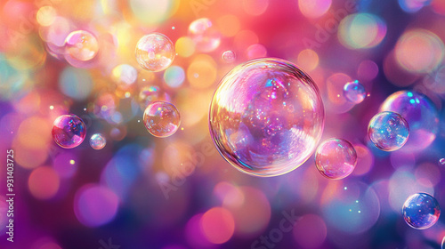 Colorful soap bubbles floating against a vibrant, blurred background in a playful atmosphere