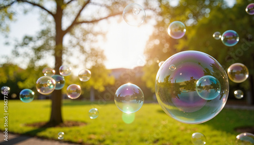 Colorful soap bubbles floating in park at sunset, joy and wonder