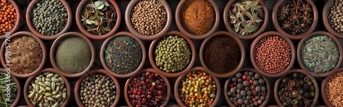 Colorful spice and herb pattern in small brown pots, high-resolution, ultra-realistic 3D rendering.