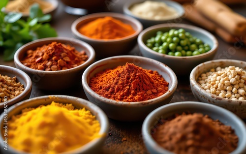 Colorful spices arranged in bowls for culinary use.