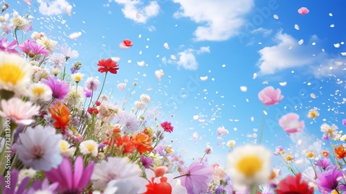 Colorful spring flowers explode in the blue sky. generative ai